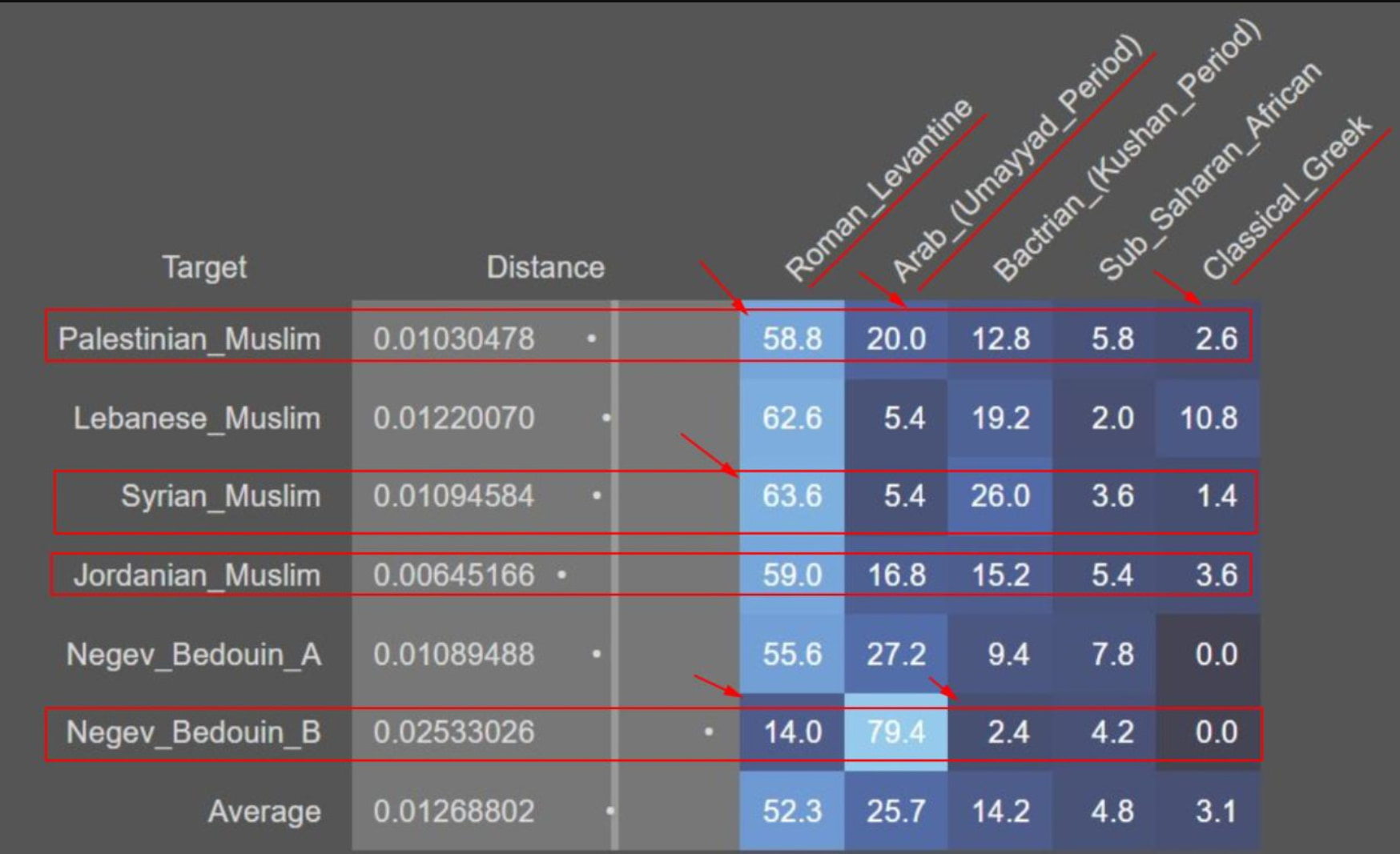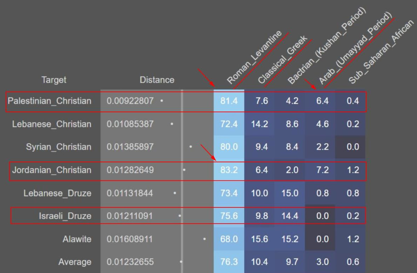 In the first slide (which is relevant to Israelites), note how Palestinian Muslims (82.8%) are much closer to Israelites than Palestinian Christians (80.4%) and Palestinian Druze (74.4%). On the other hand, in the third slide (relevant to the Roman period), the Levant's portion is smaller for Muslims at 58.8% vs Christians at 81.4%. These facts force us to ask: Is it possible that Palestinian Muslims converted straight from Judaism more recently than commonly known? Is it possible intermarriages, between Muslim men and Jewish women, were much more common than widely known? The writer of these lines is a living proof of it!
