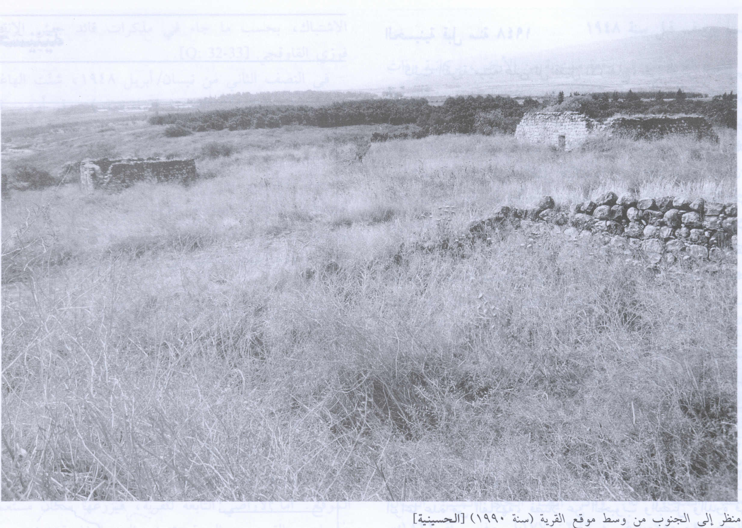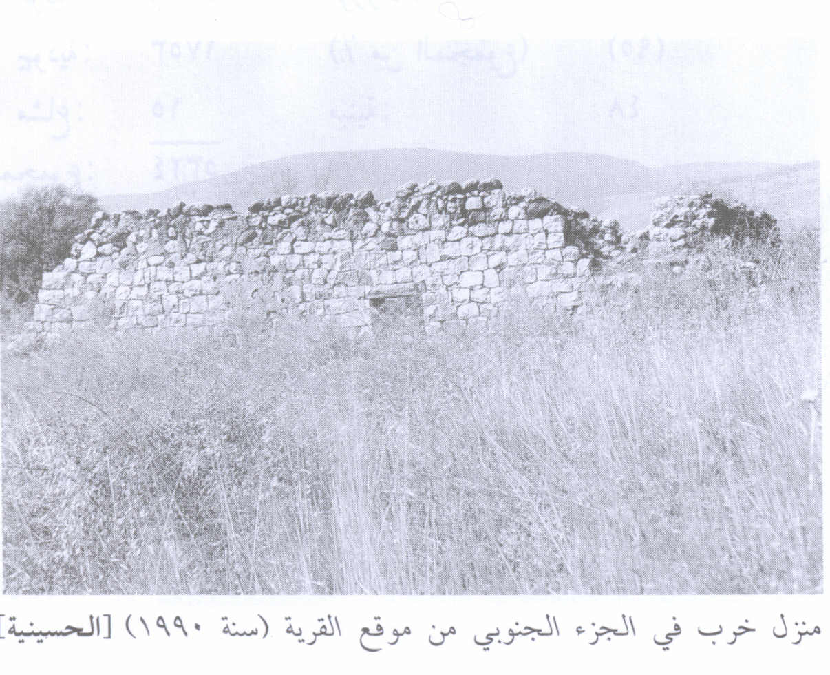 In modern times, the land between the village and Lake al-Hula was cultivated by the al-Zubaydat Bedouin. AI-Husayniyya had stone-built houses and an elementary school, which it shared with the neighboring village of Tulayl. The village land was fertile and amply supplied with underground and surface water from springs, a creek, and artesian wells. All of the villagers were Muslims who depended on agriculture for their livelihood. They grew various kinds of fruit, as well as grain, onions, and com, on the lands north of the village. In 1944/45 a total of 3,388 dunums was allocated to cereals and 22 dunums were irrigated or used for orchards. The villagers also kept livestock, especially water buffalo, for ploughing, dairy production, and meat.