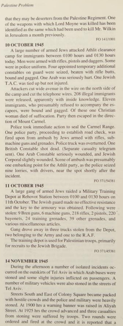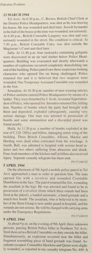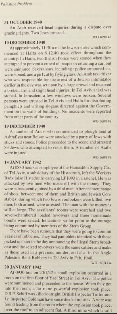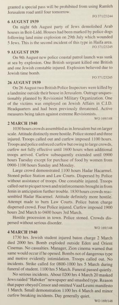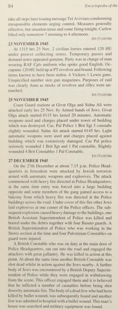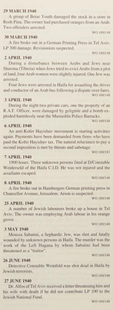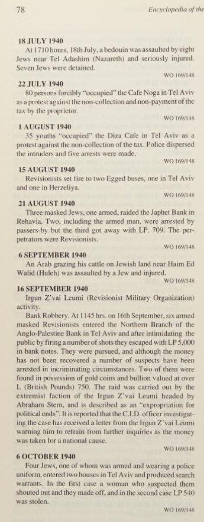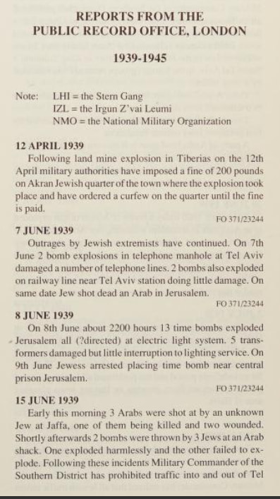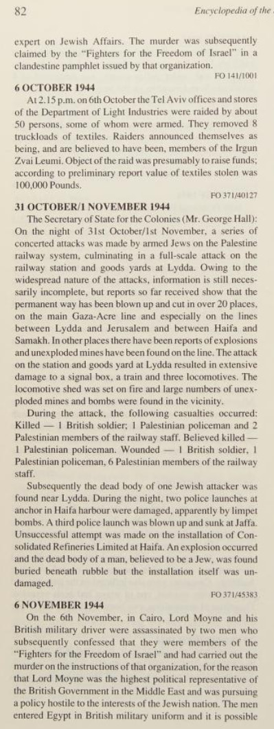 Here is listing of Zionist Jewish terror activities during WWII as it was reported by the British. Pay attention to how the so-called Yishuv managed to avoided fighting the Nazis during WWII to the bitter end. On the other hand, Zionist terror gangs managed to bomb the war efforts as you shall see below. We ask: how such fake valor didn't end up helping the Nazis? Note that the following extracts were scanned from Issa Nakhleh's "Encyclopedia Of The Palestine Problem", which you can browse the original from this link: